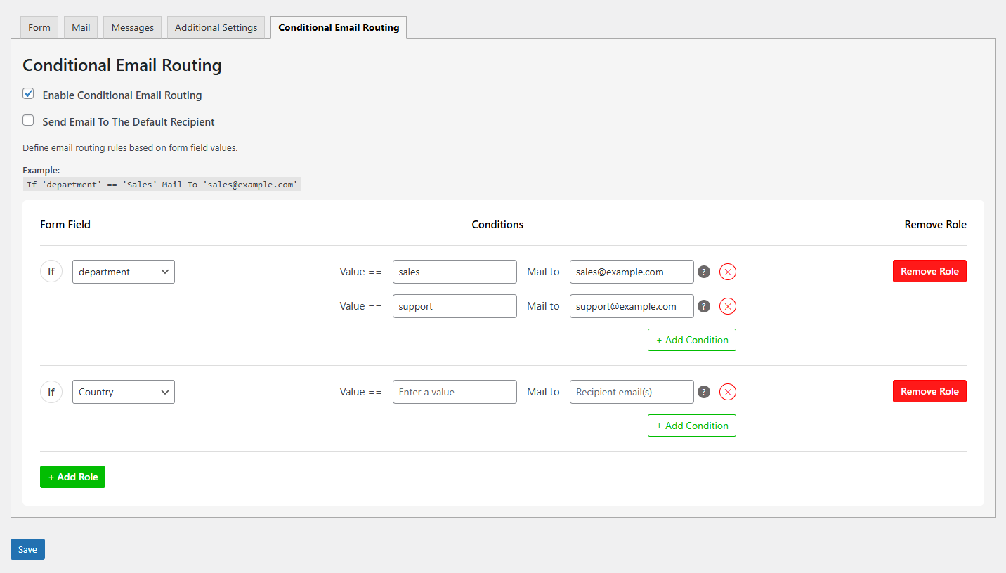 Easily add, remove, or modify routing rules directly from the Contact Form 7 editor under a dedicated "Conditional Email Routing" tab.